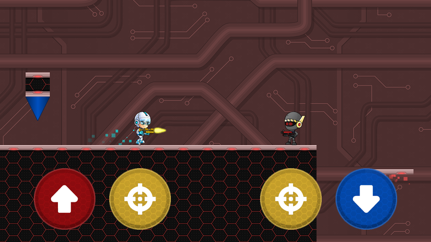 Jump, slide and shoot your way through the robot facilities!