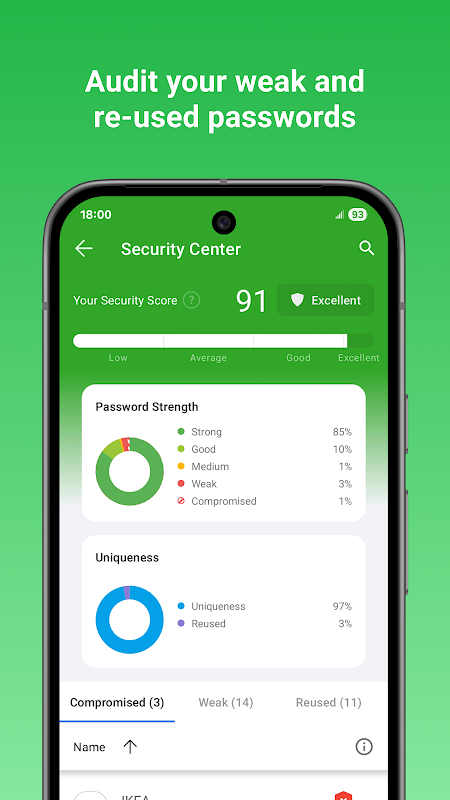 • Security Center finds your weak, re-used, or duplicate passwords.