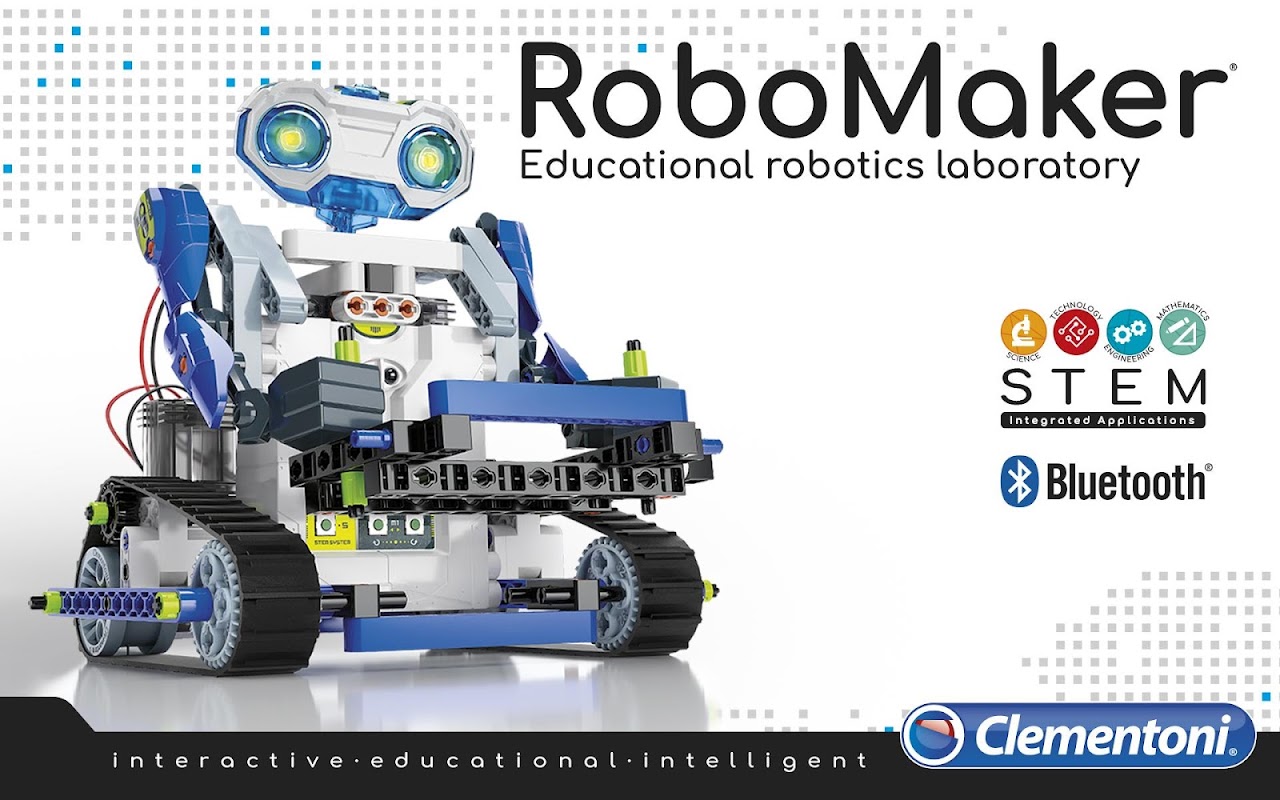 The RoboMaker® kit was created to guide you on an educational journey to introduce you to robotics, logical thinking and coding. By using the 200 and more interchangeable components present in the box, you can build 3 different robots with growing levels of complexity and then programme them in a fun way through this free application.
