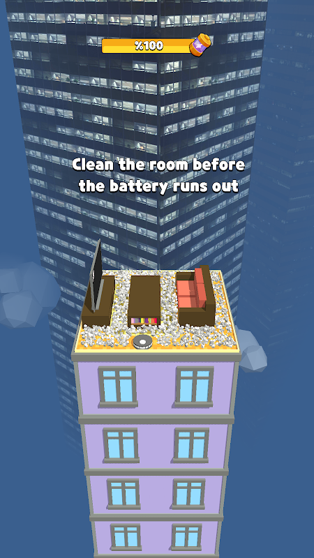 Try to clean the room and collect coins before your battery runs out.