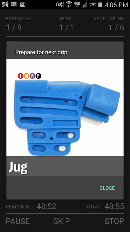 The hangboard timer is a unique feature of this app providing a timer with repetitions of short Hang and Rest periods (a Set) followed by a longer Break period. You can customize the number of Exercises, Sets and Rep(etition)s, and select the amount of time for Work, Rest and Break (rest between sets) periods. For convenience, it has 3 default training cycles for beginner moderate and advanced climbers. In these workouts hand grips are shown on the screen. It is also possible to change the settings of a default workout, or setup a complete custom workout.