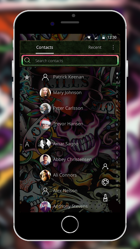 ★ contact interface and call interface rock and roll skull graffiti background, call button is cool graffiti skull art designed for street art lovers, search box with color graffiti style and skeleton graffiti theme integration.