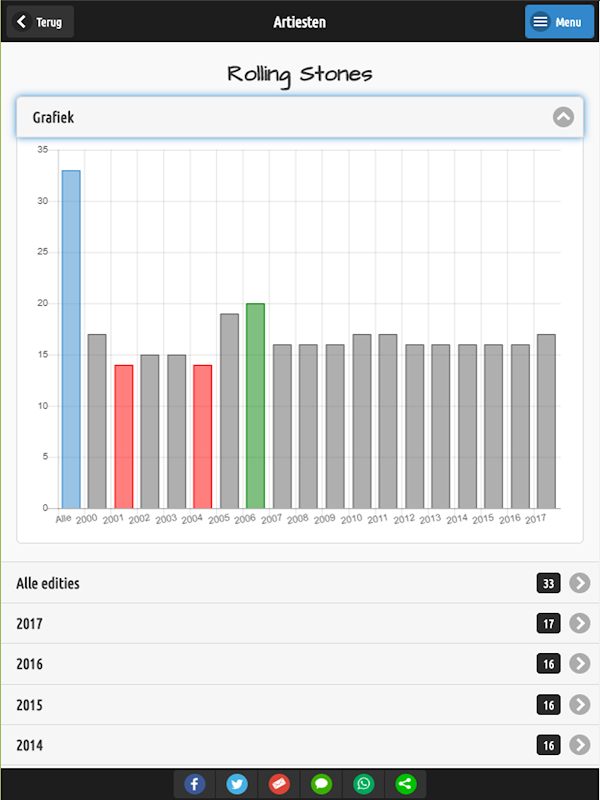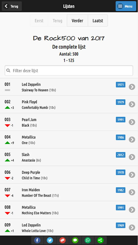 With this app you have an overview of all editions of the Arrow Rock500 from 2000 up to and including the latest edition. Search all lists, search by Artist name, Title or Year. View and share the information.