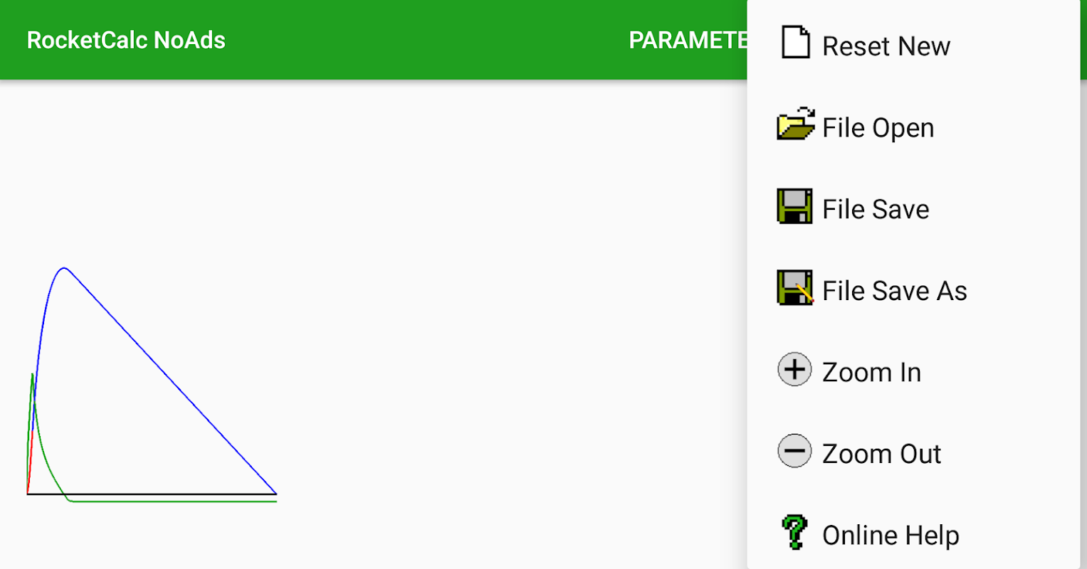 RocketCalc is a graphical calculator for determine the altitude and velocity a model rocket is likely to achieve. Enter into RocketCalc the parameters of your model rocket and rocket engine. RocketCalc will then display the likely flight profile. You can tap on the RocketCalc flight profile screen to find the altitude and velocity at any particular time during the rockets flight. Default values are for a B6 rocket engine.