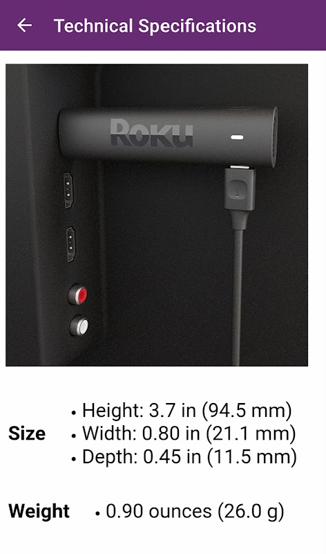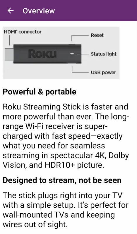 Roku streaming stick provides uninterrupted video streaming with high-speed charging and long-range WiFi receiver. The app contains information about Roku streaming stick 4k, features of the device, how to setup it and frequently asked questions.