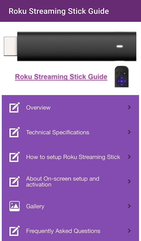 In the content of this app, you can find explanations containing the above titles. The app is a guide with information about Roku Streaming Stick.