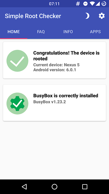 Root Checker is an application designed by following the Google guidelines about Material Design. It checks for the proper implementation of the rooting process and the installation of UNIX BusyBox package through a simple algorithm that was effective on over 150 000 different devices. Within the application, there are also a number of answers to frequently asked questions about modding on the Android platform.
