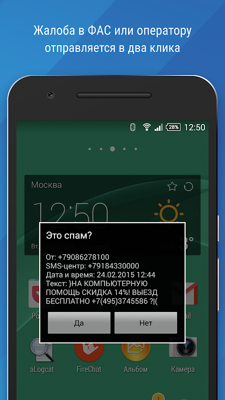The application reacts on SMS looking like spam and suggests to report it to FAS of Russia.