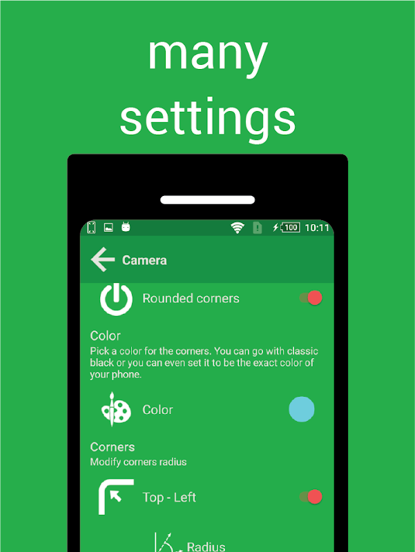 By using rounded corners, you can make a smooth transition between your phone's body and the screen. Remember, you can choose the color of the corners so that it matches the color of your phone.