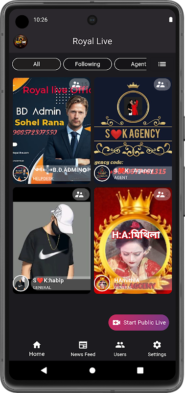 Royal Live is your platform to broadcast yourself to the world. Host a live video for others to enjoy & call a viewer to co-host your live broadcast. A great new feature to broadcast live from anywhere & at any time using your mobile phone. Show off your personality & share your story by broadcasting your hobbies, your skills and exciting events. Meet new people by chatting and direct video calling and gain followers. Earn redeemable gifts from your viewers and claim exciting rewards.