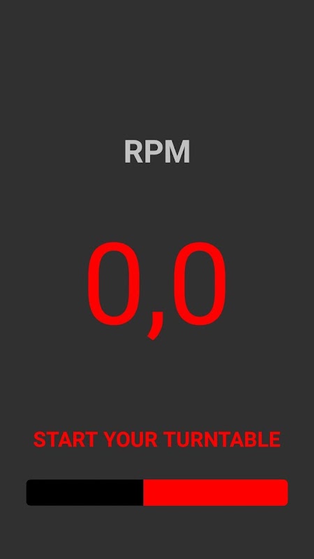 - click "start" on the app and start the turntable: the app waits 10 seconds in order to have a steady speed, then acquires data for other 10 seconds and displays average, max-min RPM values and wow estimation.