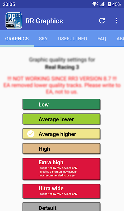 If your device is slow, but you still want to play RR game, with our app you can lower graphic quality and enjoy smooth racing. No more lag!