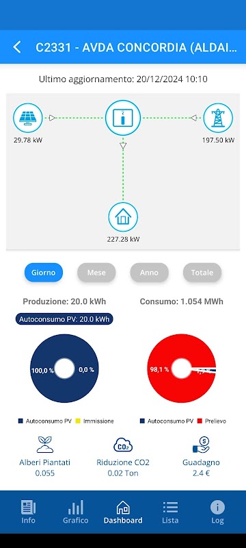 Through the meters, the values of energy produced and the economic revenue generated will always be available, also calculating the reduction of CO2 emissions and the equivalent of trees planted, without neglecting the energy values of daily, weekly, monthly, annual and total production, also represented by detailed graphs divided by day, month and year.