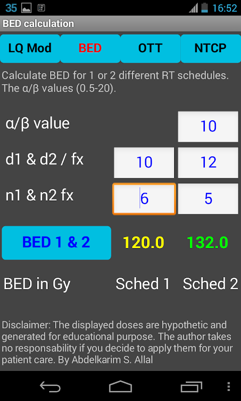 - The BED (Biologically Effective Dose) calculation for 1 or 2 RT schedules simultaneously.