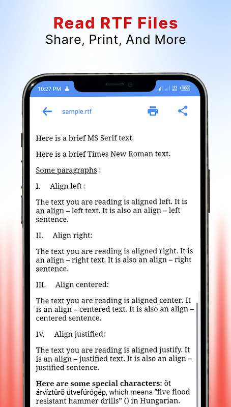 View or read RTF Files get the document reading task done by this RTF Viewer. The Good Reader can read all files of RTF type via this rtf file opener. Being a reader, you can view multiple files of rtf format with multiple exciting new features in rtf file viewer for android.