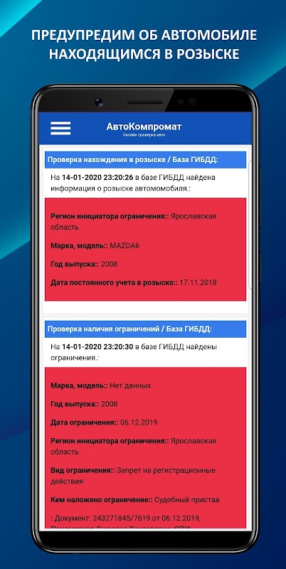 Установите приложение АвтоКомпромат и Вы сможете досконально проверить по VIN или Гос-номеру, автомобили зарегистрированные на территории России, быстро и удобно в один клик!