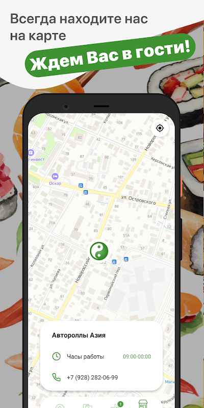 Как сделать заказ в приложении “Автороллы Азия”: выберите понравившиеся позиции из меню, добавьте их в корзину и перейдите на экран оформления заказа (по нажатию на иконку корзины).