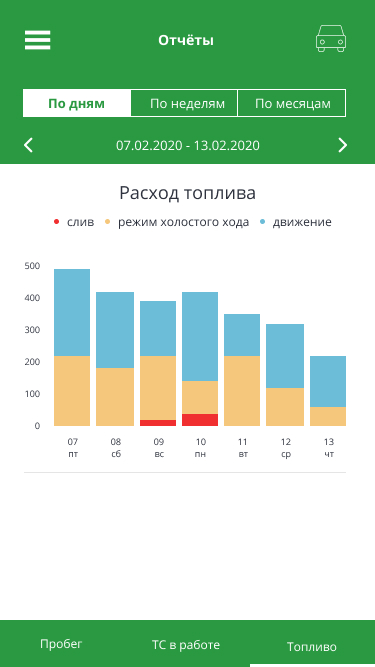 • Режим «Отчёты» - позволяет строить аналитические отчёты по пробегу, топливу и работе транспортных средств по всему автопарку.