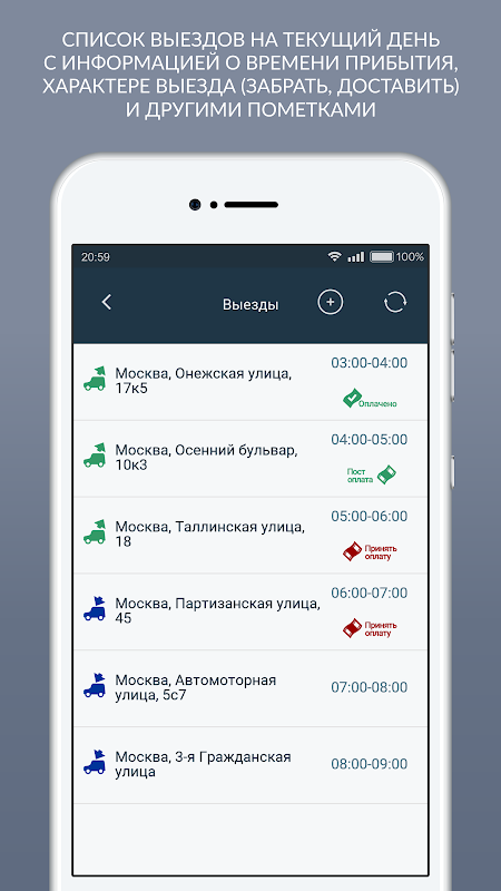 Выезд к клиенту является одним из удобных для клиента вариантов взаимодействия с химчисткой. Приложение АГБИС КУРЬЕР создано, чтобы автоматизировать работу выезда. Оно позволяет формировать очередь адресов для водителя, строить маршрут поездки, контролировать успеваемость к назначенному времени, связываться с клиентом. Через приложение возможно оформление предварительного заказа, прием оплат, вывод квитанции на чековый принтер и многое другое.