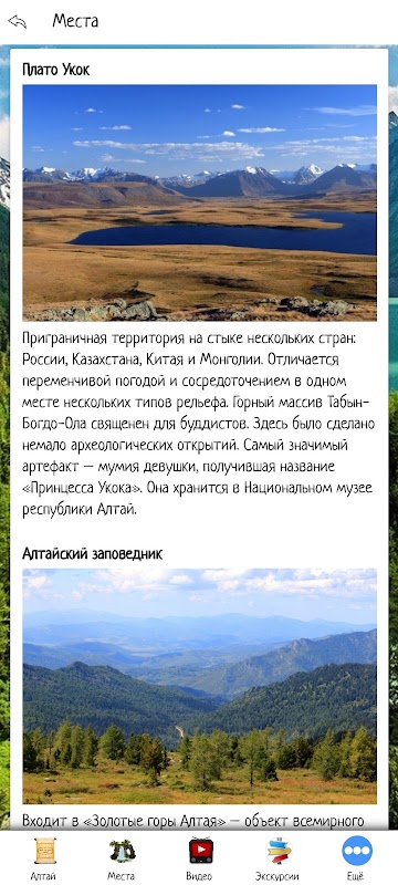 В приложении можно совершить первое знакомство с Алтайским краем, выбрать место для путешествия, посмотрев достопримечательности и видео обзоры. Также в приложении есть информация об экскурсионных бюро и отелях, предлагающих свои услуги в Горно-Алтайске.