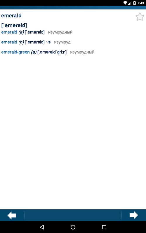Для поиска слова достаточно знать, как оно звучит. Включите режим "фонетического поиска" и находите английские слова введя их приблизительное звучание русскими буквами. Например, введите "эмеральд" и получите "emerald"!
