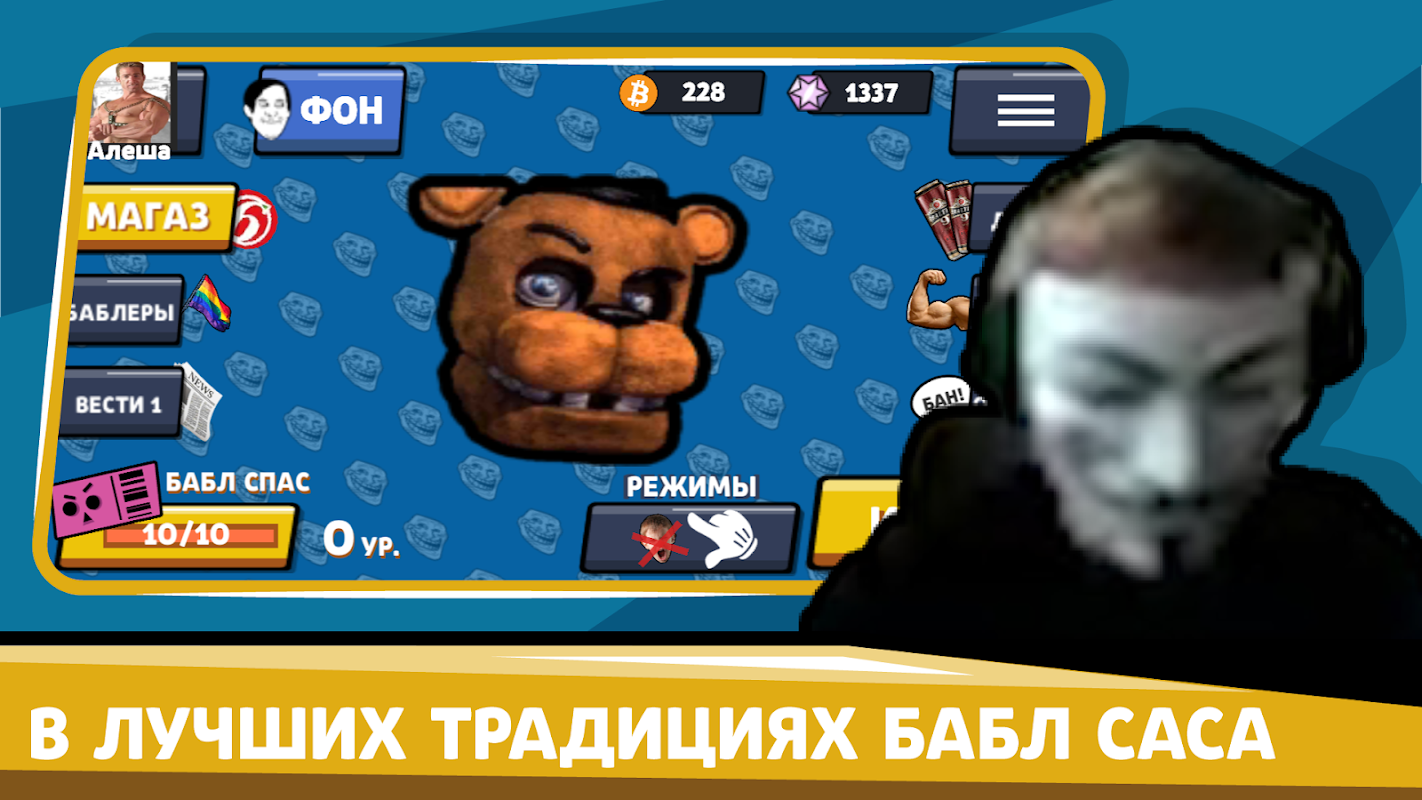 Проходи мини игры и заробатывай гемы бабл сас для открытия сундуков и стар боксов с которых ты получишь самые крутые мемы!
