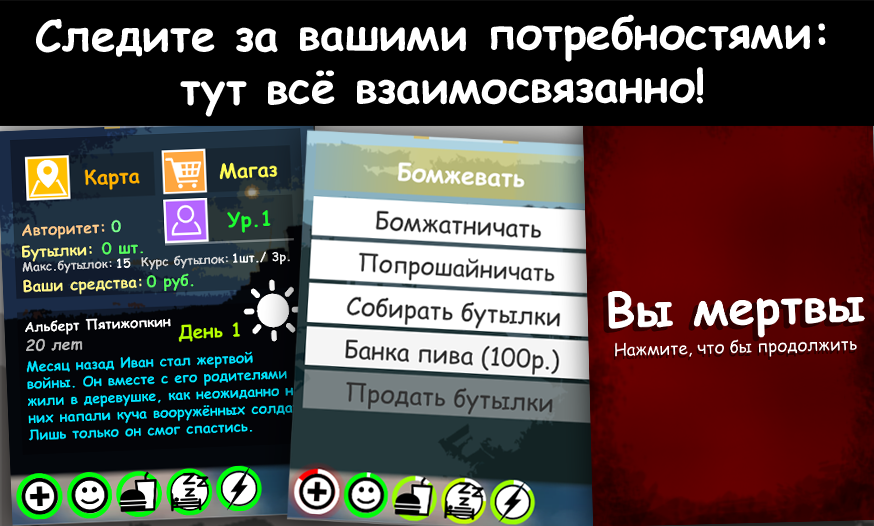 - Перемещайтесь по карте и исследуйте новые локации! Сходите в магазин и купите себе еду или спрячьтесь от дождя в подъезде!