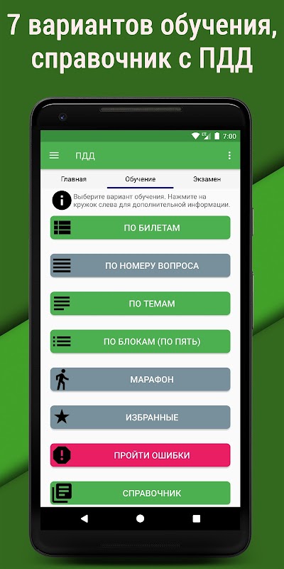 В приложении находятся тренировочные и экзаменационные режимы, специально разработанные для быстрого освоения билетов CD.