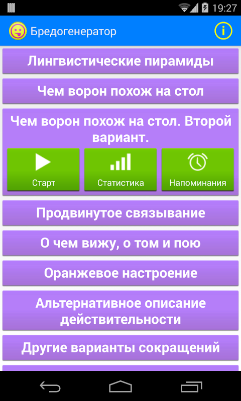 Приложение поможет вам в тренировке бредогенератора. Описание упражнений взято из книги Филиппа Богачева "Пикап. cамоучитель по соблазнению (РМЭС 2.0)"