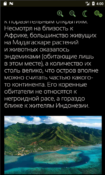 Приложение поддерживает режим "ночного чтения".Приложения запоминает, где вы остановились для каждой категории. Благодаря этому вы сможете позже возобновить чтение с того же места.
