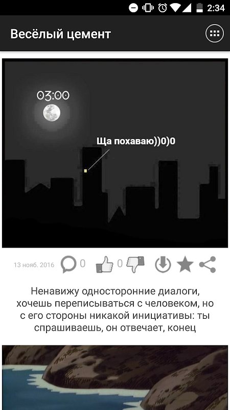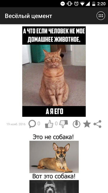 Ежедневные обновления и самых смешных приколов! Только отборный юмор! Анекдоты и смс переписки, шутки из чатов и личных переписок, мемы и демотиваторы, прикольные картинки и картинки с приколами, самые популярные люди вконтакте, видеоблогеры и знаменитости, шутки про котов и кошек, приколы с собаками. Приколы над друзьями и приколы на каждый день. Самое позитивное и поднимающее настроение приложение для твоего телефона или планшета! Смешные приколы из групп МДК, Орлёнок, Юмор без Границ, Корпорация Юмора, Шутки, Анекдоты и других популярных групп. Весёлый цемент зарядит тебя позитивом каждый день!