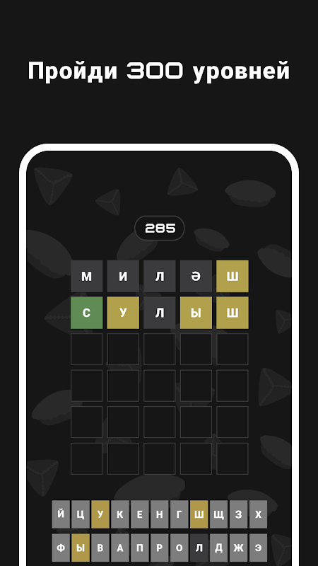 Загадано слово состоящее из пяти букв на татарском языке. Необходимо за шесть попыток отгадать загаданное слово, при этом вводя другие слова. Будут даваться подсказки: есть ли буквы из веденного слова в загадочном. Зеленая ячейка - буква есть и на своем месте, желтая ячейка - буква но не на своем месте, серая ячейка - буквы в слове нет.