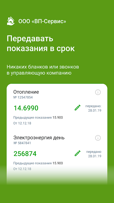 • Увидеть предыдущие показания счетчиков и передать новые;