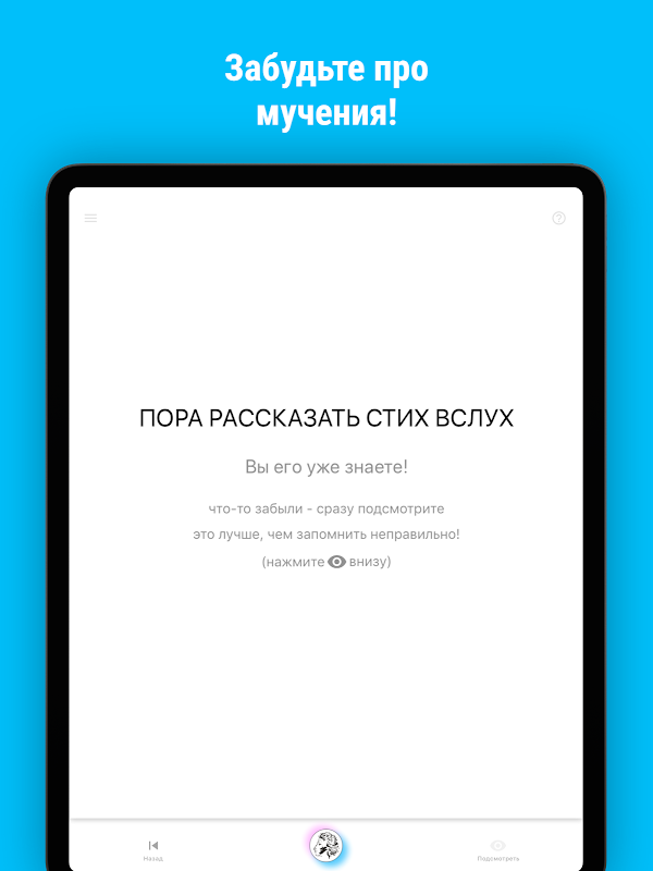Теперь Вы можете учить стихи наизусть без мучений с приложением «Выучить Стихи». Вам нужно только читать. Остальное сделает Ваш мозг. Проверено на нескольких поколениях!