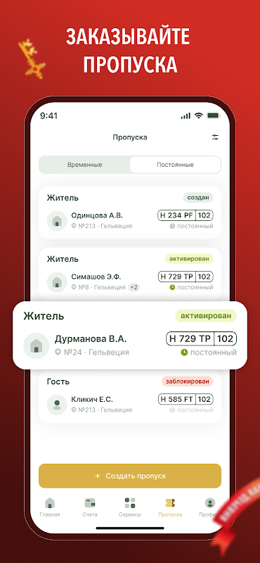 Теперь можно создавать пропуска для всех лиц: гостям, курьерам, грузовым авто, исполнителям. Пропуском можно поделиться. Также, вы можете сделать постоянный пропуск для себя и близких и отправить заявку для регистрации RFID пропуска, после чего забрать его в офисе.