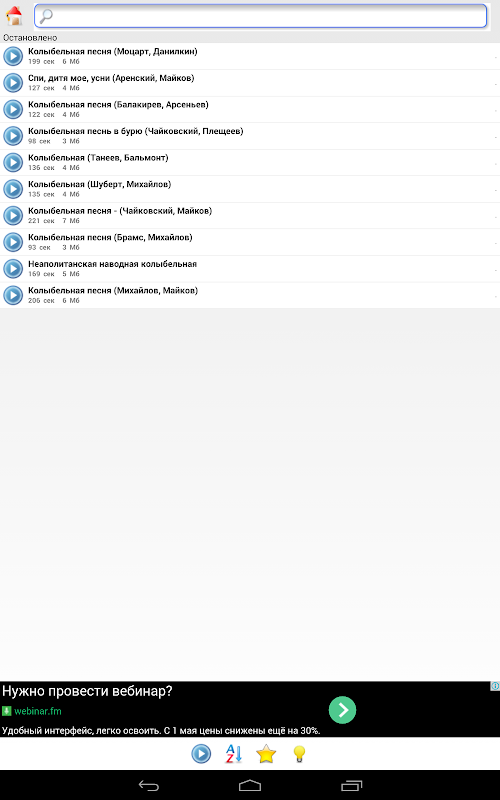 Это приложение - сборник детских колыбельных песен для Вашего малыша. Сборник включает в себя 10 разделов со старыми, добрыми колыбельными русских и зарубежных авторов. Музыка для колыбельных написана выдающимися музыкантами нашего и прошлого века, такими как Чайковский, Моцарт, Бетховен.