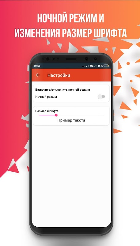 • Возможность настройки приложения: изменение размер шрифта и ночной режим;