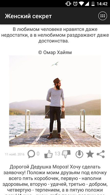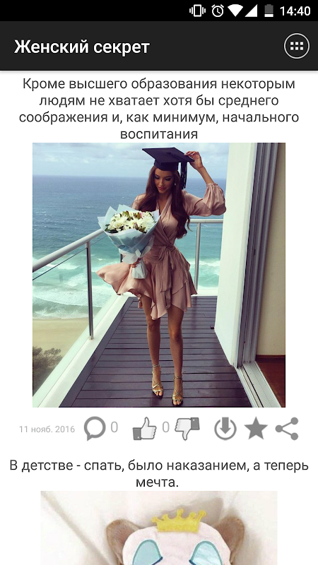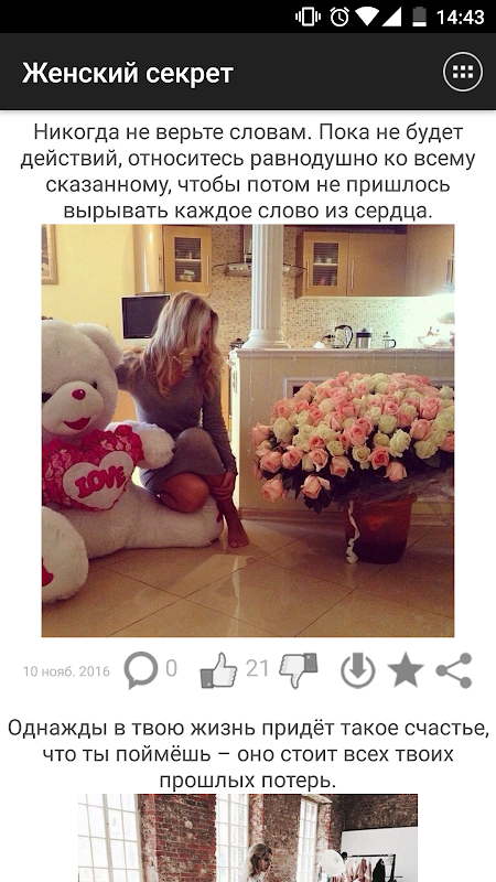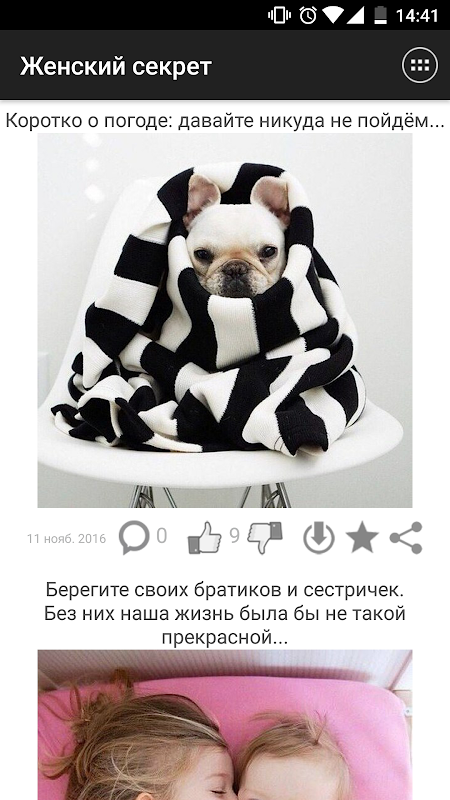 Понравившиеся записи можно комментировать и оценивать. Все понравившиеся картинки можно сохранять в галерее устройства в папке приложения. Ты можешь делиться записями с друзьями через социальные сети, а так же другие установленные на устройстве приложения. Ну и конечно, ты можешь оставлять лайки и сохранять записи в избранное.