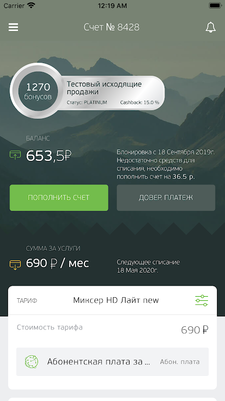 Состояние вашего счета, остаток средств и суммы для пополнения в режиме онлайн.