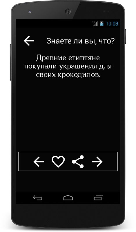 Нашли что-то интересное – поделитесь с друзьями любым фактом через социальные сети и мессенджеры. Простой и приятный интерфейс, ничего лишнего, удобный скролинг по интересным фактам, возможность добавлять в избранное и скопировать в буфер.