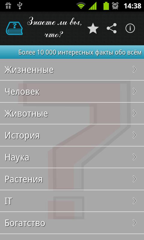 30 категорий занимательных фактов с удобной сортировкой, возможность сохранять избранные страницы и пересылать друзьям смской или публиковать на страницах социальных сетей. Начните разговор с понравившимся человеком со слов «Знаете ли вы, что…», и вы легко приобретете новые знакомства и репутацию эрудита. С нашим приложением вы не будете скучать в дороге, узнаете много нового, полезного и невероятного и получите пищу для размышлений.