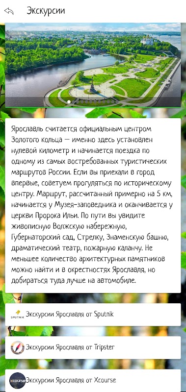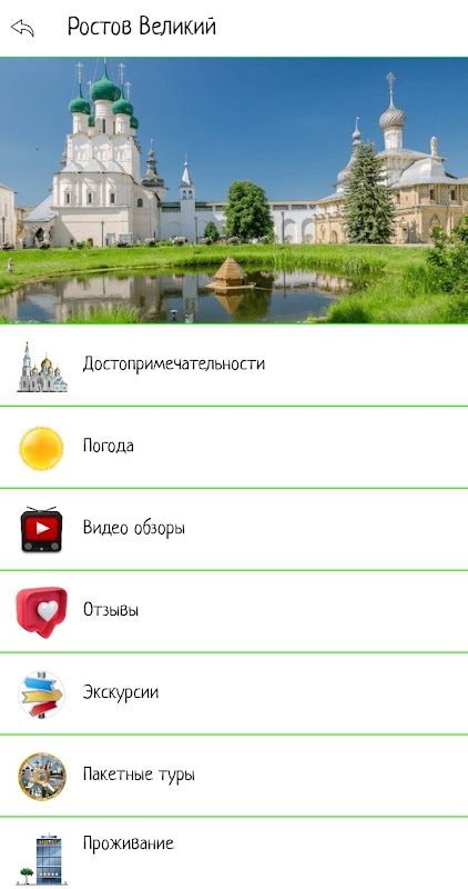 В этом приложении можно совершить первичное знакомство с городами Золотого кольца России, выбрать место для путешествия, посмотрев достопримечательности и видео обзоры. Также в приложении есть информация об экскурсионных бюро и отелях, предлагающих свои услуги в выбранном городе.