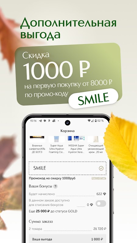 Начните с выгоды - скидка 1000 руб. на первую покупку от 8000 руб. по промо-коду SMILE. Откройте для себя мир красоты с ИЛЬ ДЕ БОТЭ! За первую регистрацию в мобильном приложении “ИЛЬ ДЕ БОТЭ” вы получаете 500 бонусов на любой парфюм и косметику.
