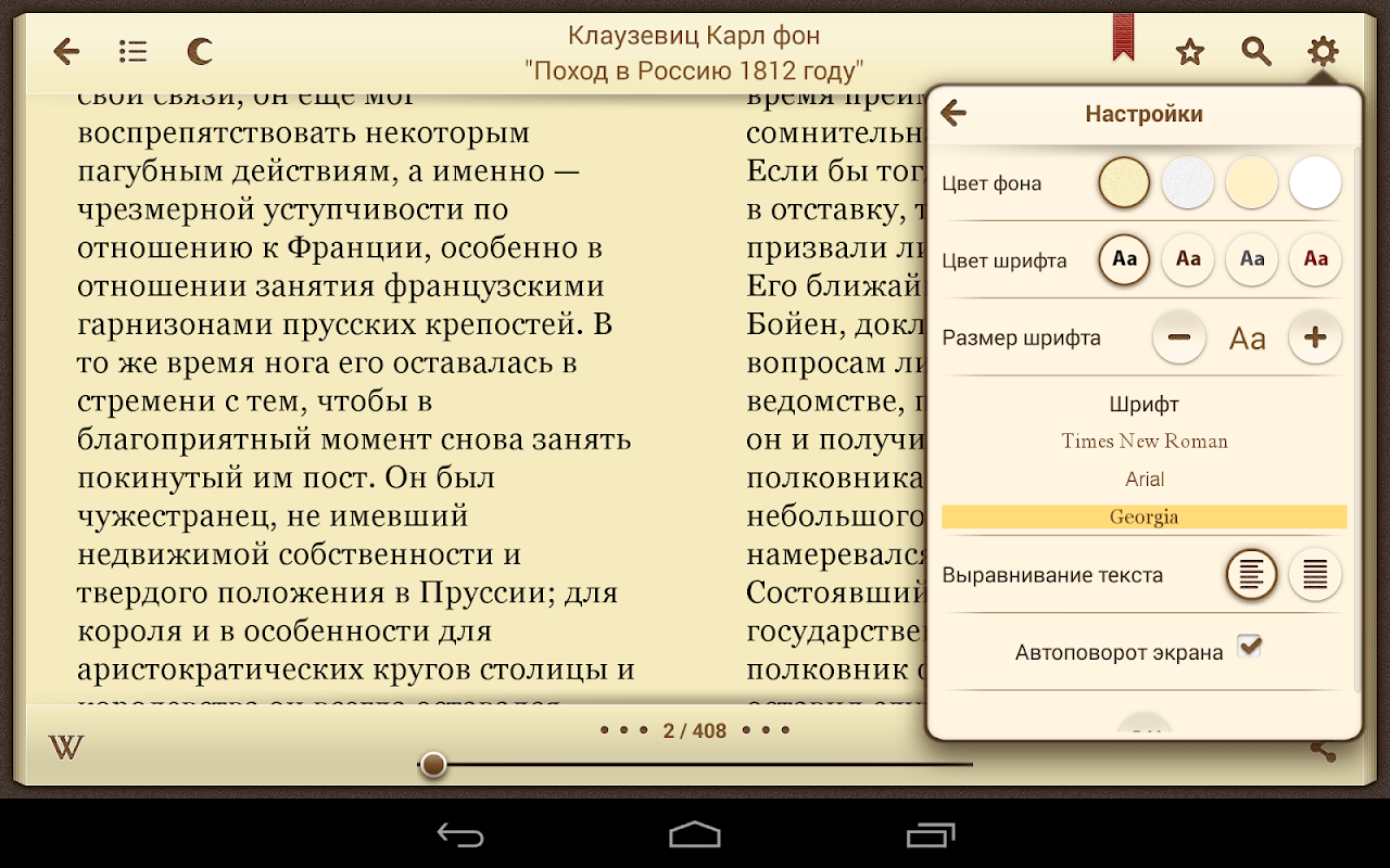 • Гибкие настройки отображения текста (выбор шрифта, изменения цвета и фактуры фона "бумаги")