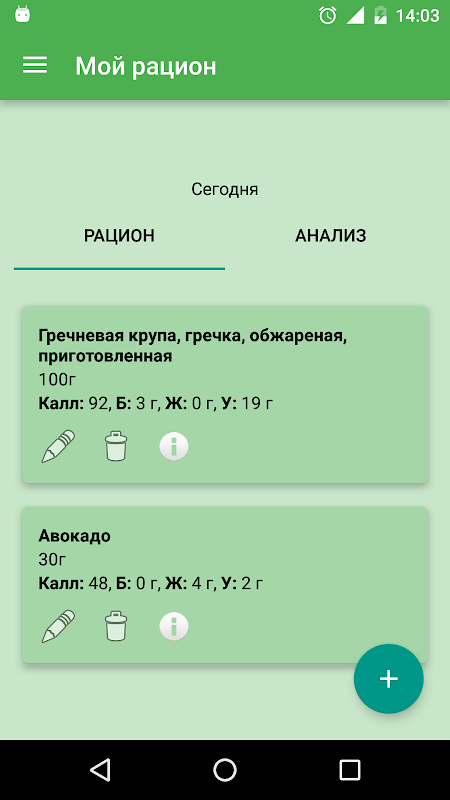Приложение содержит примерно 1000 базовых продуктов. Также есть возможность добавлять собственные продукты.