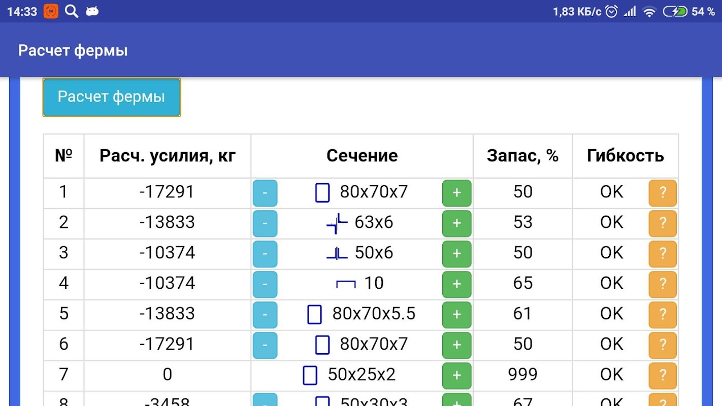 Задайте сосредоточенную нагрузку на узлы фермы и нажмите на следующий шаг либо выберите "Задать нагрузку на площадь" и задайте распределенную нагрузку на 1м2 и шаг между фермами. Сосредоточенная нагрузка P на узел при этом пересчитается.