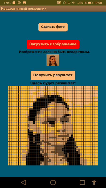 Представьте фото в виде мозаики из квадратиков. Загрузите фото, нажмите на кнопку, подождите 1 - 3 минуты и вы получите красивый результат.