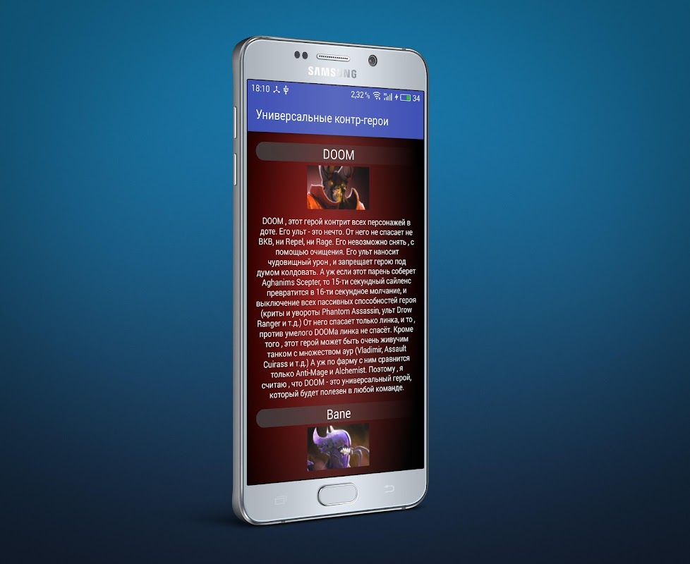 Данное приложение разработано игроком для игроков на основании многолетнего опыта игры в Dota и Dota 2. Оно поможет Вам с выбором оптимального пика героев. Познакомит с некоторыми особенностями игровой механики. И в целом будет очень полезным дополнением для Вас, как для игрока Dota 2. В этом приложении собраны все самые популярные контр-пики героев, универсальные контр-пики. Также приложение содержит много полезных советов для начинающих игроков.