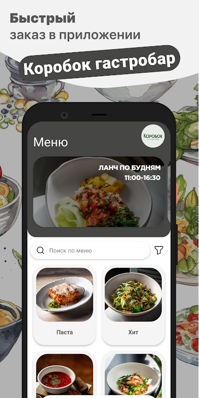 Как сделать заказ в приложении “Коробок гастробар”: выберите понравившиеся позиции из меню, добавьте их в корзину и перейдите на экран оформления заказа (по нажатию на иконку корзины).