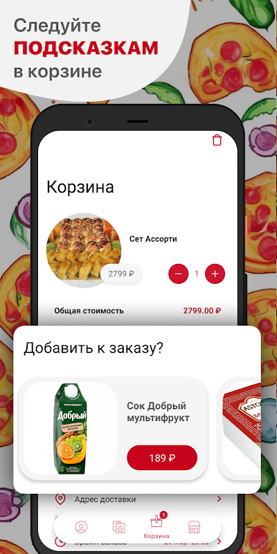 Как сделать заказ в приложении “Лавка Доставка”: выберите понравившиеся позиции из меню, добавьте их в корзину и перейдите на экран оформления заказа (по нажатию на иконку корзины).